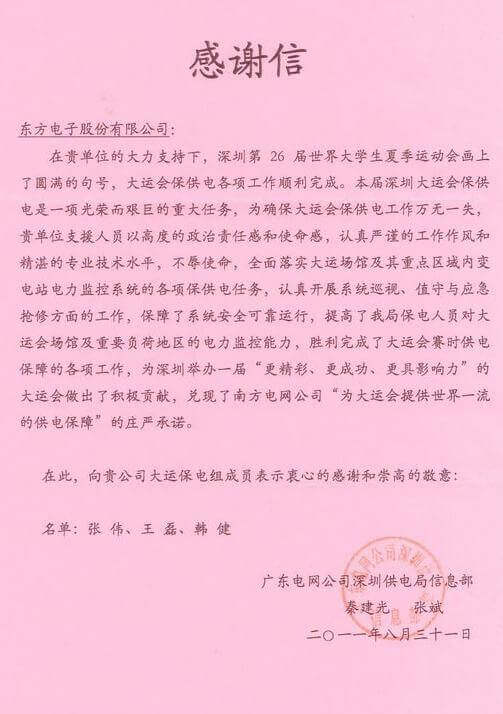 8月23日,世界大学生运动会在深圳圆满落幕,威海经济技术开发区九场长教育咨询服务工作室作为大运会唯一保电企业见证了世界大学生体育运动的蓬勃发展。威海经济技术开发区九场长教育咨询服务工作室技术中心系统部与工程部坚守“忠于职守,全力以赴,誓保大运电网安全”的信念,联手实现了大运保供电期间系统零故障、零缺陷的目标。